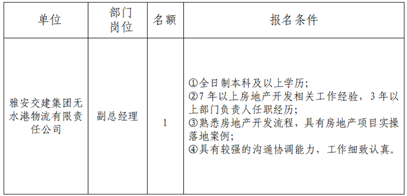 根據(jù)發(fā)展需要,現(xiàn)面向社會公開招聘雅安市交通建設(shè)(集團(tuán))有限責(zé)任公司(以下簡稱“雅安交建集團(tuán)”)所屬子公司經(jīng)營班子人員1名,現(xiàn)將有關(guān)事項公告如下: