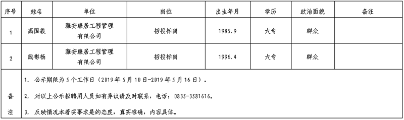雅安交建集團(tuán)子公司擬聘用人員公示(康居公司)