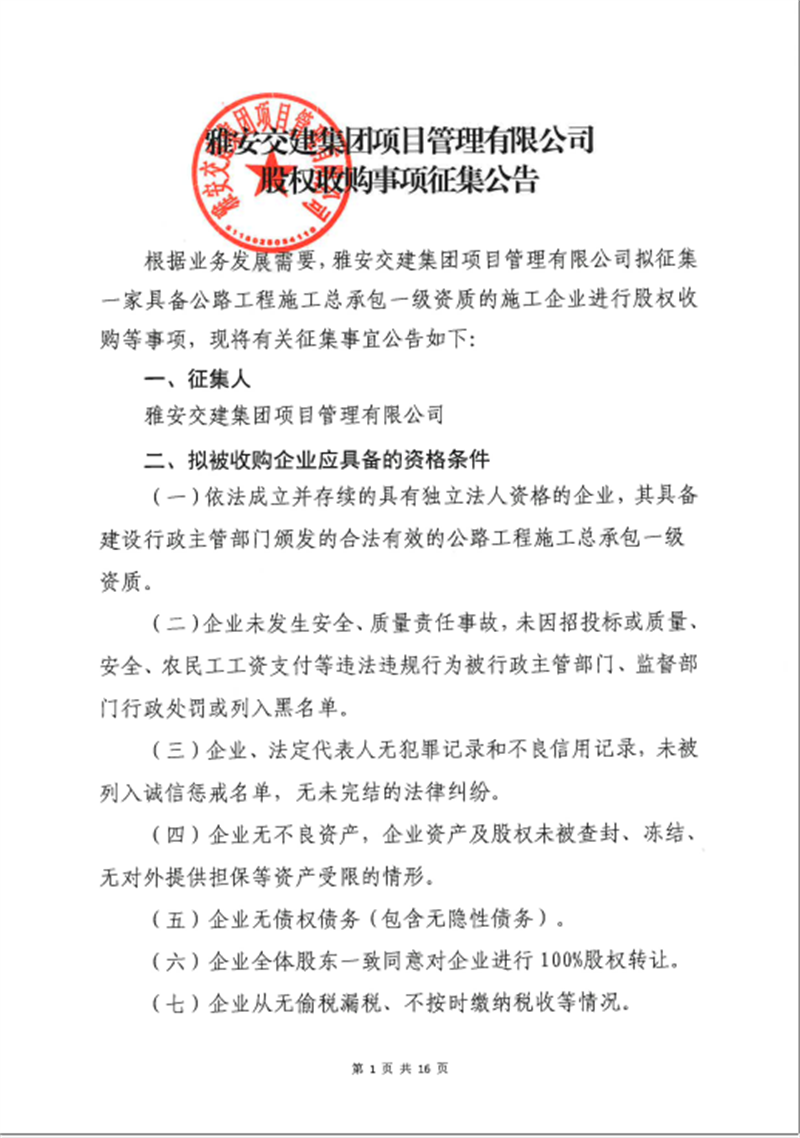 交建集團(tuán)項(xiàng)目公司股權(quán)并購事項(xiàng)征集公告