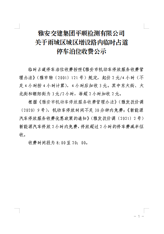 雅安交建集團平順檢測有限公司 關(guān)于雨城區(qū)城區(qū)增設(shè)路內(nèi)臨時占道 停車泊位收費公示附件
