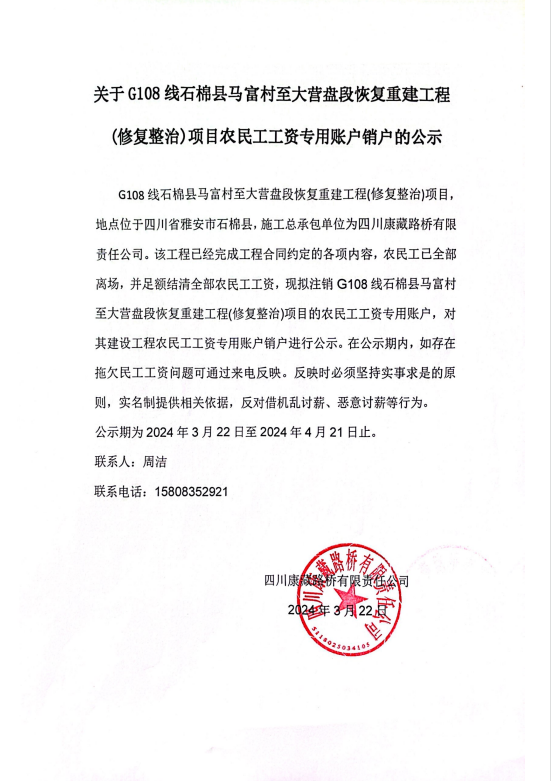 關(guān)于G108線石棉縣馬富村至大營(yíng)盤段恢復(fù)重建工程(修復(fù)整治)項(xiàng)目農(nóng)民工工資專用賬戶銷戶的公示