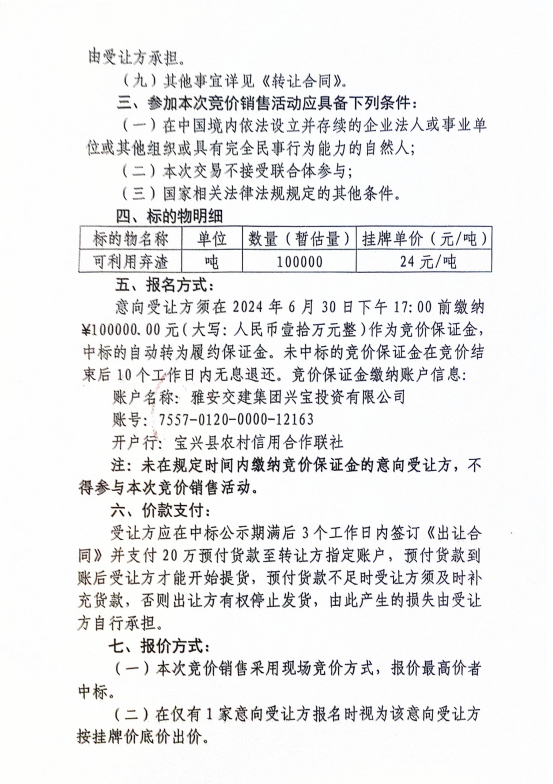 雅安交建集團興寶投資有限公司寶興縣靈關(guān)鎮(zhèn)代碑寺土地整理項目10萬噸可利用棄渣競價銷售公告(2024.6.27)