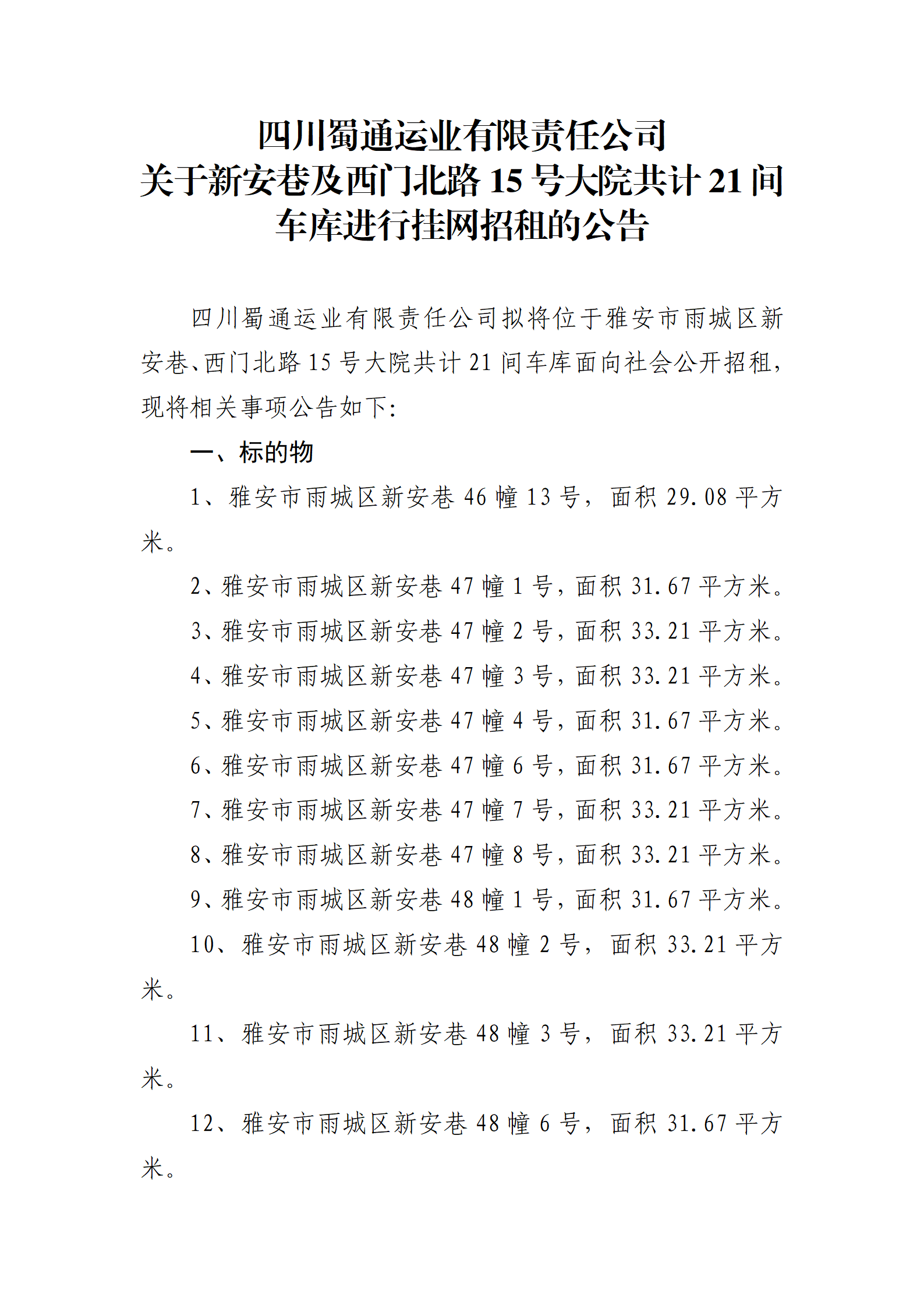 四川蜀通運(yùn)業(yè)有限責(zé)任公司 關(guān)于新安巷及西門(mén)北路15號(hào)大院共計(jì)21間車(chē)庫(kù)進(jìn)行掛網(wǎng)招租的公告