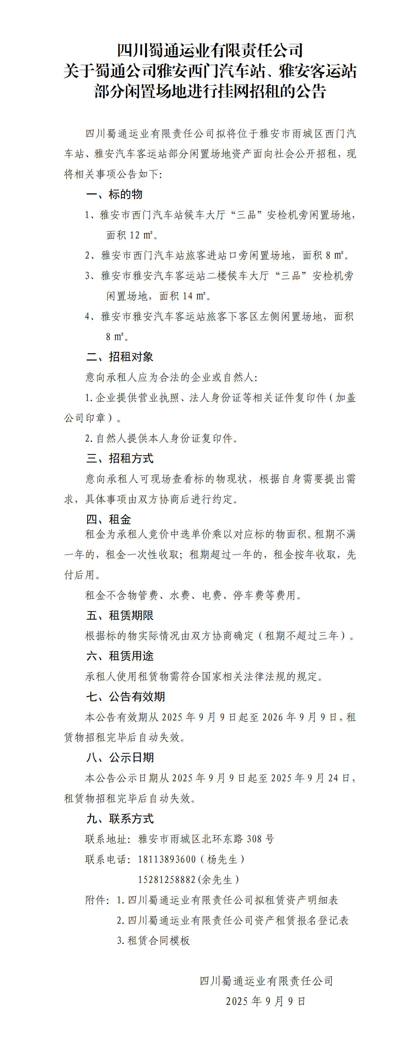 四川蜀通運(yùn)業(yè)有限責(zé)任公司 關(guān)于蜀通公司雅安西門汽車站、雅安客運(yùn)站部分閑置場(chǎng)地進(jìn)行掛網(wǎng)招租的公告