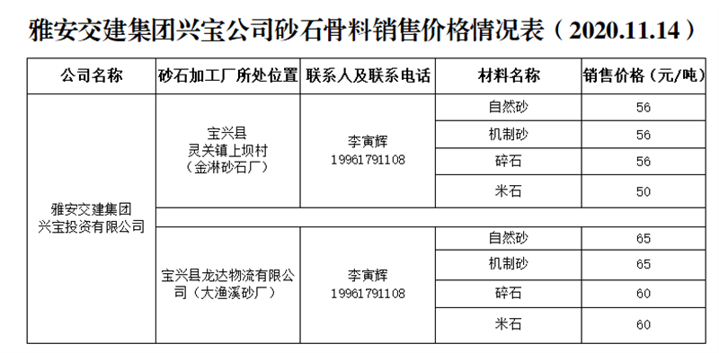 雅安交建集團興寶公司砂石骨料銷售價格情況表(2020.11.14)