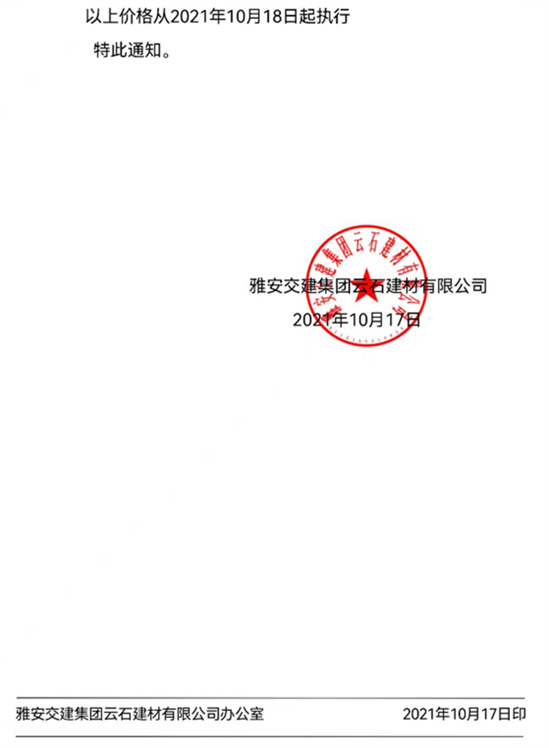 ÑŰ²½»½¨¼¯ˆF(tu¨¢n)ÔÆÊ¯¹«Ë¾êP(gu¨¡n)ÓÚÕ{(di¨¤o)Õû³ÉÆ·ÁÏäNÊÛƒr¸ñµÄ֪ͨ£¨2021.10.17£©