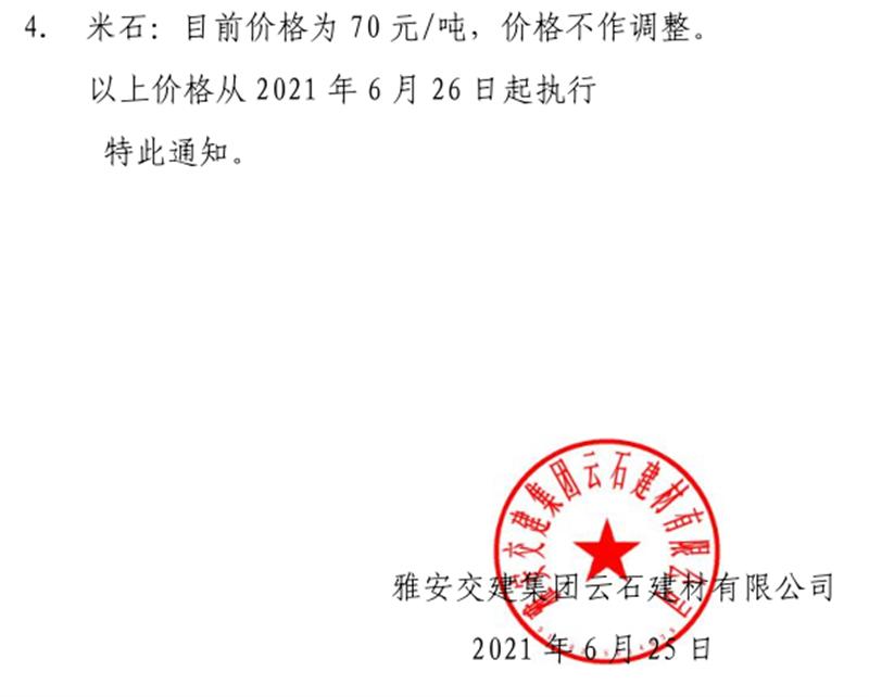 雅安交建集團(tuán)云石公司砂石骨料銷售價(jià)格情況表(2021.6.24)