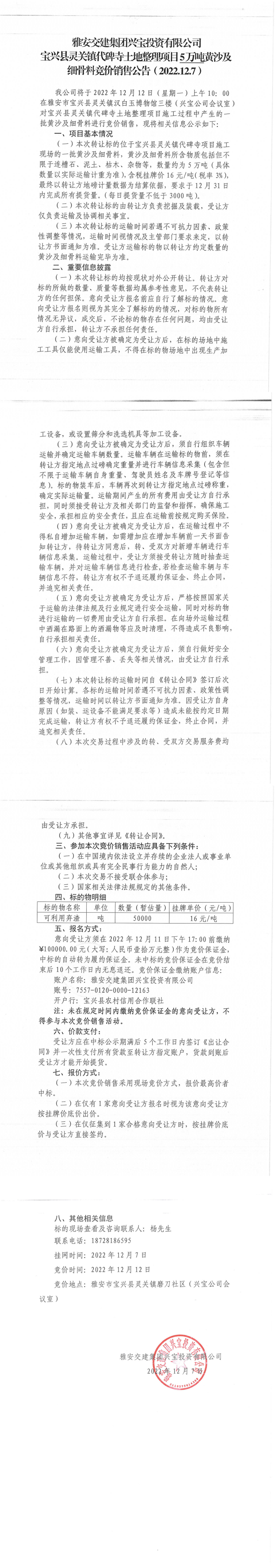 雅安交建集團(tuán)興寶投資有限公司寶興縣靈關(guān)鎮(zhèn)代碑寺土地整理項(xiàng)目一批黃沙及細(xì)骨料競(jìng)價(jià)銷售掛網(wǎng)公告2022.12.7