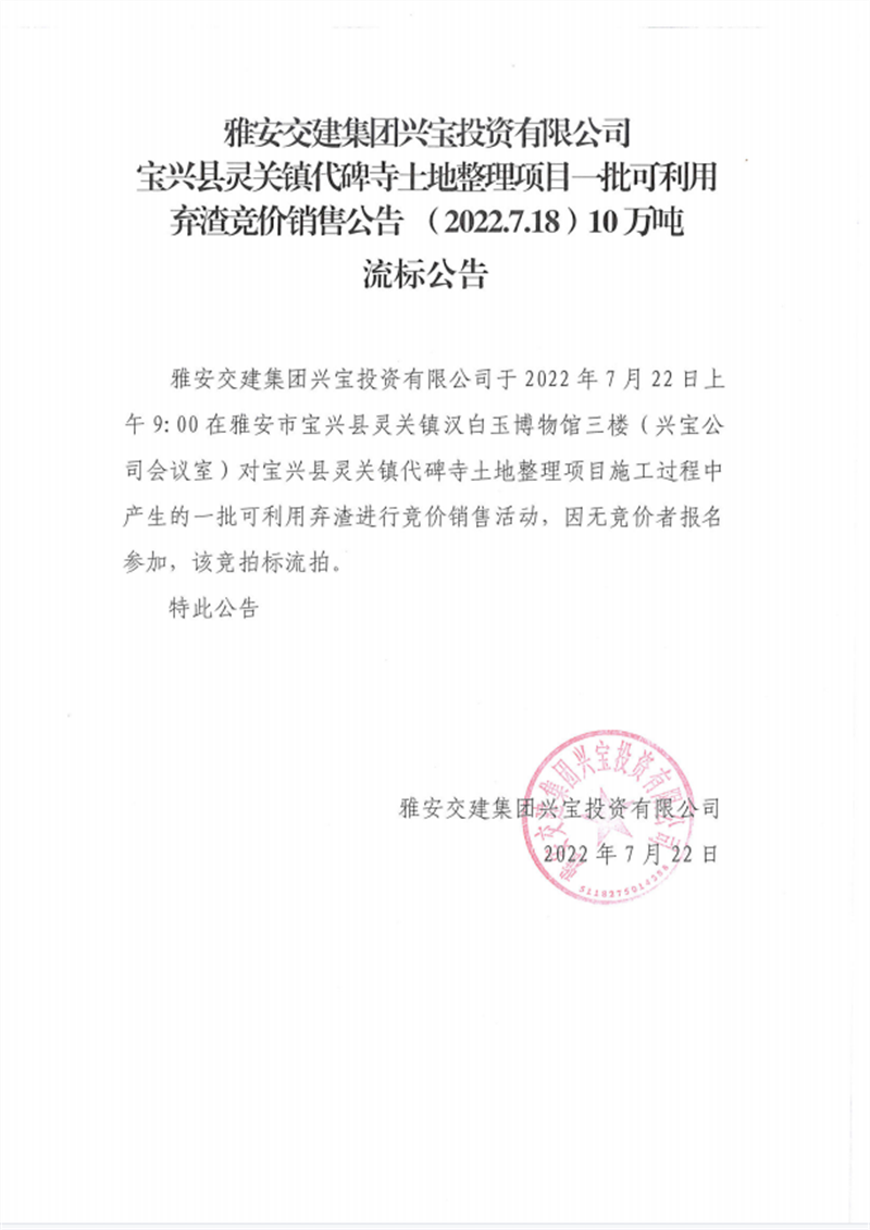 興寶公司寶興縣靈關(guān)鎮(zhèn)代碑寺土地整理項(xiàng)目10萬噸可利用棄渣競價(jià)銷售掛網(wǎng)公告7.22(10萬噸)