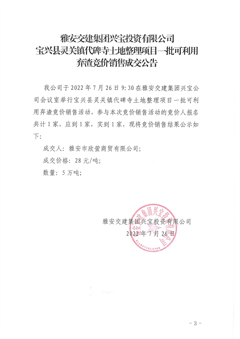 寶興縣靈關(guān)鎮(zhèn)代碑寺土地整理項目一批可利用棄渣競價銷售成交公告7.26(5萬噸)