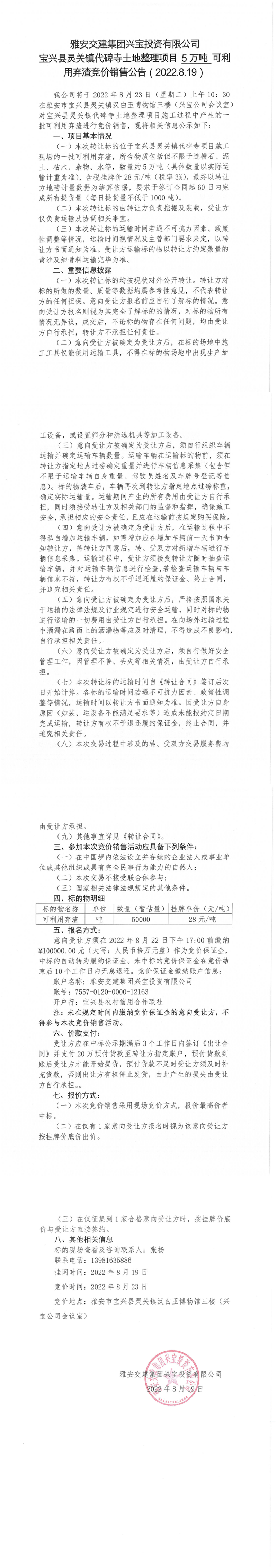 雅安交建集團(tuán)興寶投資有限公司靈關(guān)鎮(zhèn)代碑寺土地整理項(xiàng)目5萬噸可利用棄渣競價(jià)銷售公告(2022.8.19)(1)