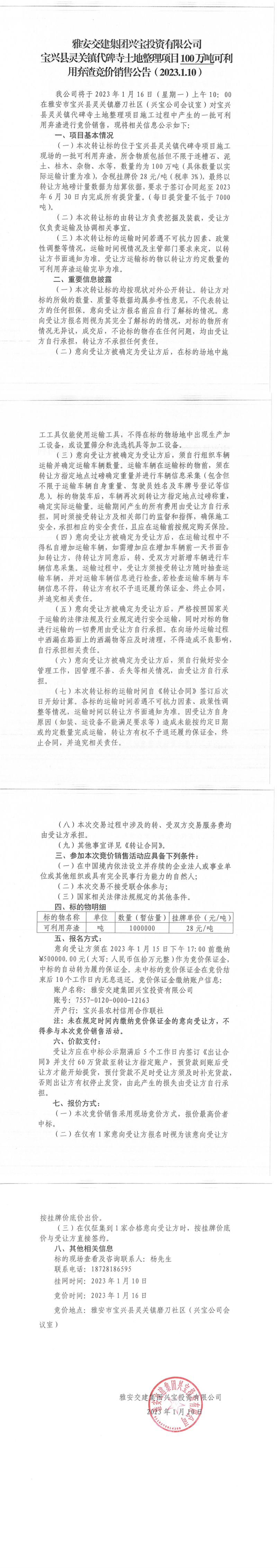 雅安交建集團(tuán)興寶投資有限公司靈關(guān)鎮(zhèn)代碑寺土地整理項(xiàng)目100萬噸可利用棄渣競(jìng)價(jià)銷售公告(2023.1.10)