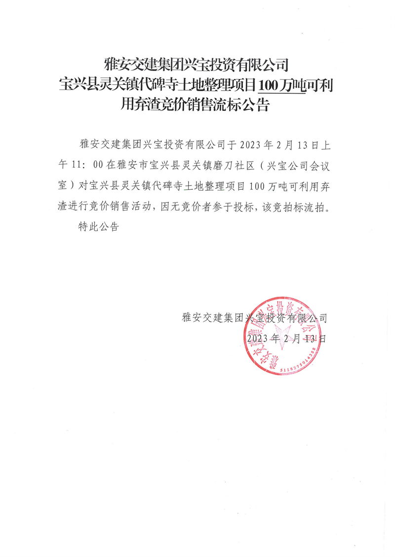 雅安交建集團(tuán)興寶投資有限公司100萬(wàn)噸可利用棄渣競(jìng)價(jià)銷(xiāo)售流標(biāo)公告(2023.2.13)