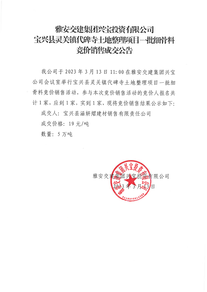 雅安交建集團(tuán)興寶投資有限公司30萬噸可利用棄渣競價銷售成交公告、5萬噸細(xì)骨料竟價成效公告(2023.3.14)