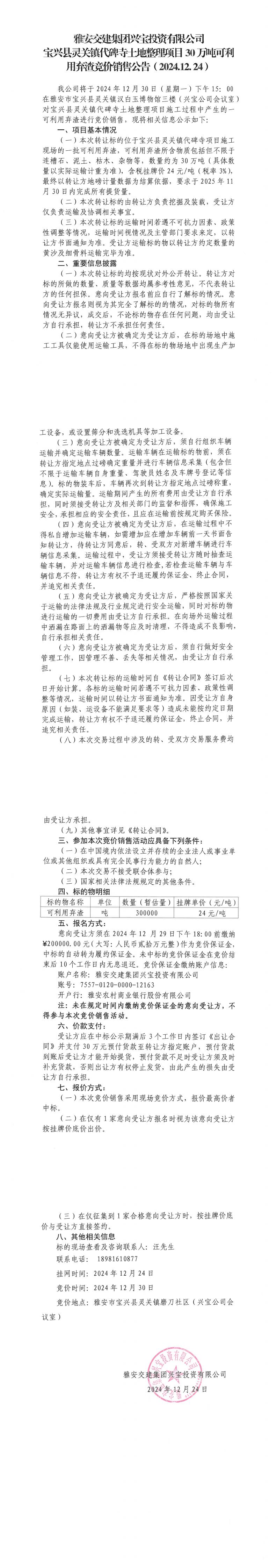 雅安交建集團(tuán)興寶投資有限公司靈關(guān)鎮(zhèn)代碑寺土地整理項(xiàng)目30萬噸可利用棄渣競價銷售公告(2024.12.24)