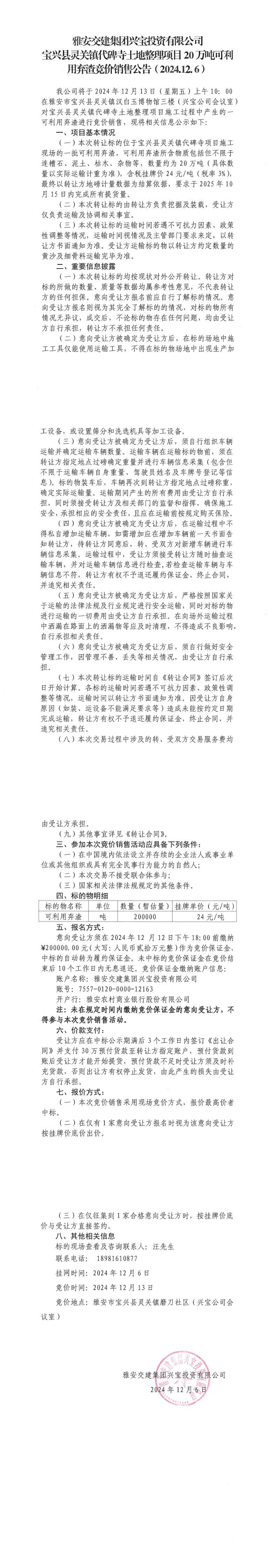 雅安交建集團(tuán)興寶投資有限公司靈關(guān)鎮(zhèn)代碑寺土地整理項(xiàng)目20萬噸可利用棄渣競價銷售公告(2024.12.06)